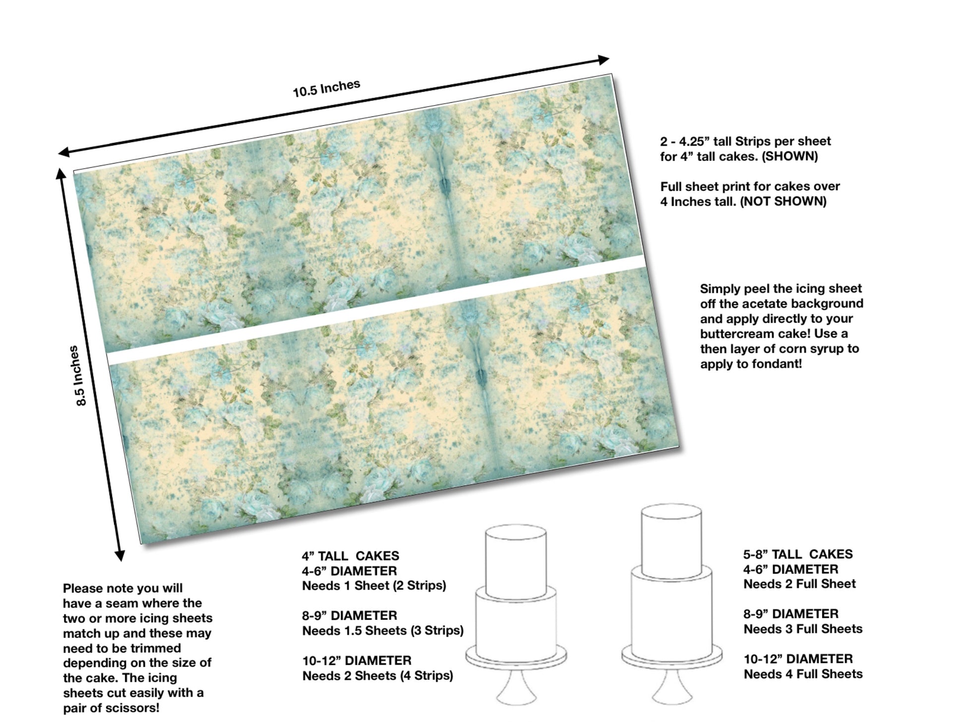 Standard size CAKE WRAPS are 4 inches high by 10 inches long per strip. You may need a pair of scissors to trim your cake wraps/icing sheets. Different size cakes and different-height cakes will require the following amount of strips: